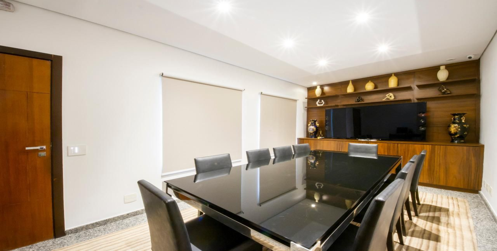 Tv 80 polegadas preparada para Vídeo conferência Com automação em toda a sala Persianas, tv, ar condicionado acionamento por voz, cafeteira, máquina de refrigerante.